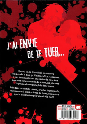 Donc on commence ce manga avec Taki qui est très maniaque et amoureux de Mika, mais ce garçon n'ose pas lui avouer ses sentiments ni même oser faire grand chose en temps normal. Et c'est lors d'une agression dans la rue qu'un homme va lui "sauter" dessus et que tous les problèmes vont commencer. Il ne se souviendra de rien, mais à son réveil il va avoir des pulsions meurtrières envers Mika. Surtout des visions assez gores (mais pas assez à mon goût au vu du titre et du résumé). On le voit soit la tuer, soit Mika déjà morte.